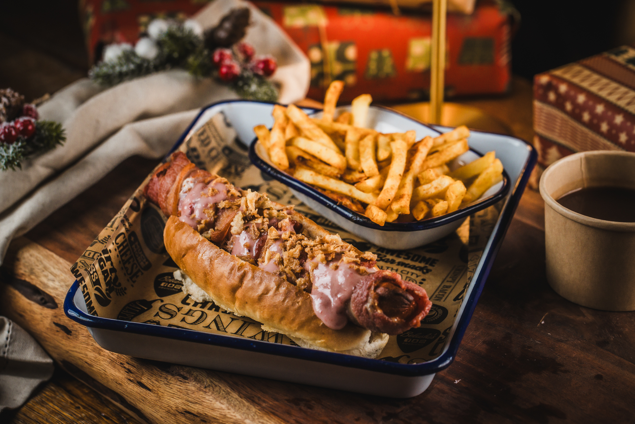 Pig in Blanket Hot Dawg: Gourmet hot dog wrapped in streaky bacon, brioche bun, gravy.