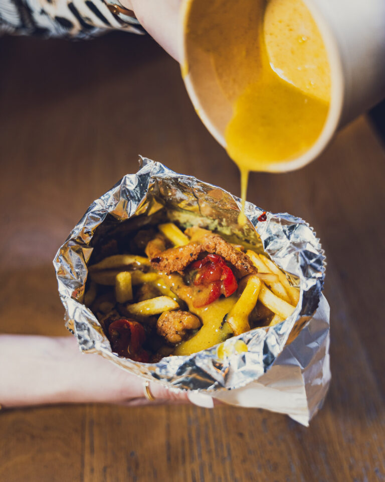 Tossed in proper Chinese-style seasoning with sautéed onions, peppers, spring onions, and chips — plus chip shop curry sauce because we’re not monsters.